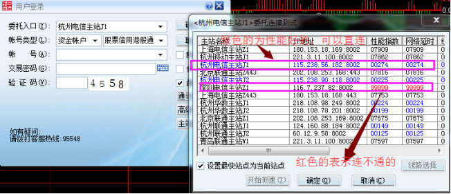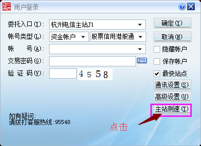 另外选择点击右上角“委托”,可进入“交易登录界面”再点击“主站测速”,可以对交易中心服务器进行测试。测试后界面如下图所示。