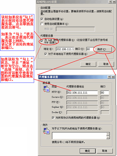 选择“局域网设置”后,弹出如下对话框,在该界面中查看是否设置了代理服务器。如下图所示: