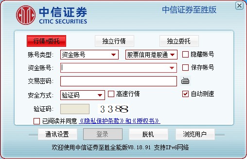 大家都知道中信证券旗下推出了很多具有自身的特色,适合不同的客户使用的产品,这也正好符合有的客户喜欢分析行情,有的客户需要快速浏览,快速找到自己想要的股,还有一些喜欢综合性的分析,那么今天带来的中信证券至胜全能版官方版,是一款别具特色的证券股票软件,拥有十分独特的功能,能够满足用户的操作需求。该软件不仅为广大投资者提供了一套功能强大的免费网上证券交易理财终端,是投资者炒股的必备工具,具备行情速度快、资讯内容丰富、操作简单明了等优势,支持持仓资产快速刷新、成交回报主动推送、多银行存管、ETF认购,债券质押式报价回购业务、货币基金、理财、全国股份转让交易、质押回购业务、融资融券和港股通、股票期权、新股一键申购等功能,并且本版本取消了通讯密码选项,采用验证码方式认证。该系统较之其它网上交易系统和投资通行情交易系统来说,具有功能完善,操作快速便捷,性能非常稳定等特色,有需要的朋友欢迎下载体验吧。