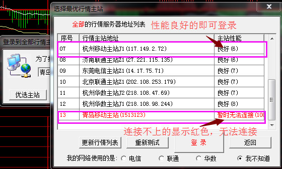 点击“优选主站”后,弹出“选择最优行情主站”界面,程序会自动检测行情主站服务器,测试完毕后会出现如下图界面,选择主站性能为良好的主站进行登录即可。