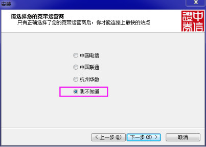 2、点击上图的“下一步”按钮,弹出如下安装界面,若您知道您的宽带运营商,可以自主选择,若不知道,默认勾选我不知道按钮,即可帮您自动判断: