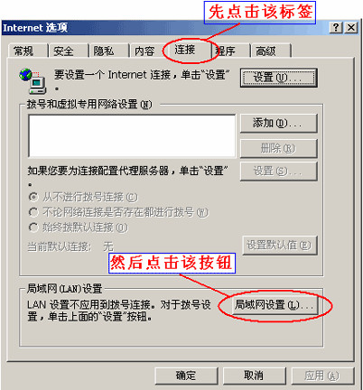 选择“Internet选项”菜单后弹出如下界面,选择“连接”标签,并点击“局域网设置”按钮。如下图: