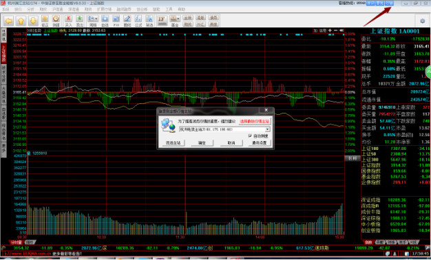 双击打开桌面快捷方式图标,输入账号密码登录后,进入行情界面如下图,点击右上角的行情按钮,弹出如图中间行情主站的登录框。