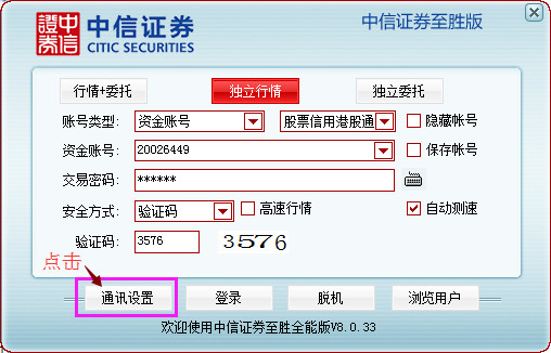 请点击确定按钮,并退出“通讯设置”界面。您就可以输入帐号登录到我们的服务器,查看实时行情、资讯以及买卖股票进行交易了。