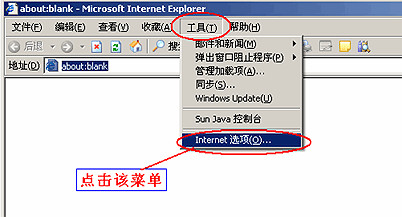 打开IE浏览器,点击“工具”菜单里的“Internet选项”。如下图: