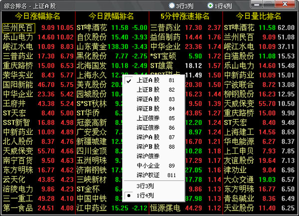 敲数字81、82、83、84、85、86、87,可分别调出上海A、B股,深圳A、B股,沪债、深债,深沪A股的综合排名。系统用9个排成方阵的小窗列出所选市场的股票的涨幅、跌幅、振幅、5分钟涨幅、5分钟跌幅、量比、委比、成交金额排名。在综合排名中可以使用右键菜单选择查看不同的市场信息,同时可以按“3行3列”或“1行4列”的方式选择查看的方式。