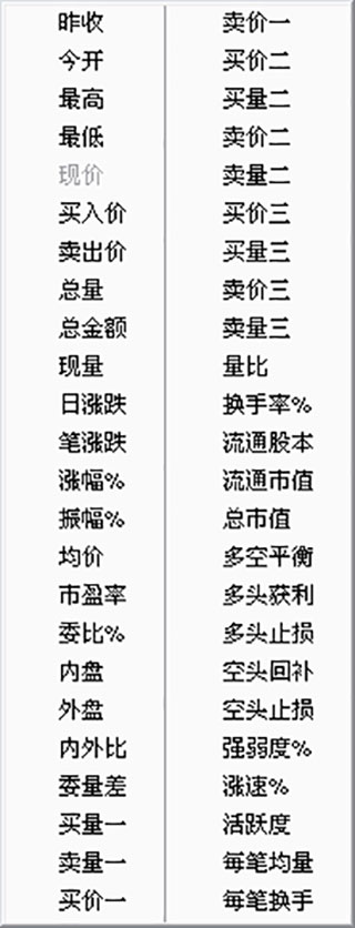 要想更换某一栏的内容,请用鼠标右键点击其栏目名称,然后从弹出菜单上选择新栏目。例,右键点击『现价』栏,弹出菜单后,找到『市盈率』,左键点击它,则该栏目内容换成市盈率。