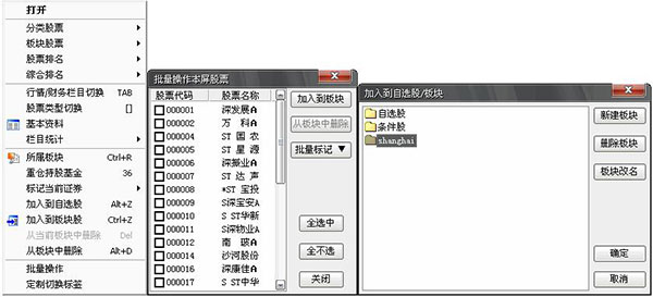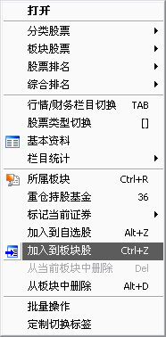 按前面介绍的方法找到需要的股票后,用鼠标右键点击它,从弹出菜单上选择〖加入到自选股〗或〖加入到板块〗,或按Ctrl+Z。删除自选股按ALT+D