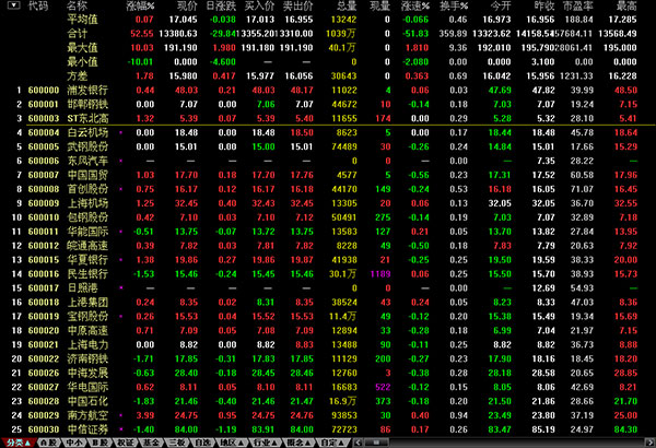 进入系统后,屏幕上首先出现行情显示窗口,列表显示最新股票交易行情。窗口顶部是主菜单条。注意,主菜单条的右端有两组按钮,分别控制系统窗口和其子窗口的最小化、层叠/还原、关闭。该系统支持整屏放大功能,整个界面就像在DOS下一样。拖动纵向滚动条,或按〖PageUp〗与〖PageDown〗,可看到更多股票的行情。拖动横向滚动条,可看到更多栏目内容。