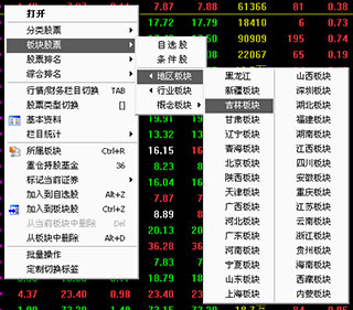 单击左上角的符号或按空格键,可以进行各种类似Excel的统计操作。点击右键弹出菜单,也可选择不同的股票市场及板块。自选股、板块股、条件选股是系统内置的,分别切换到不同股票群的报价牌。例如,右键点击板块股,会有下面的弹出菜单,供用户切换到其他板块的报价牌。