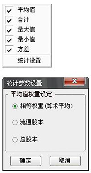 按照“平均值”、“合计”、“最大值”、“最小值”、“方差”五种统计方式显示当前行情栏目的所有数据,同时可以使用“统计设置”进行设置