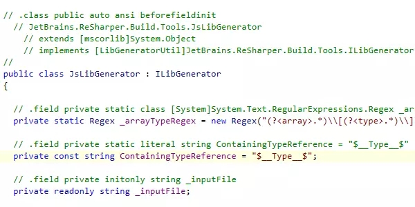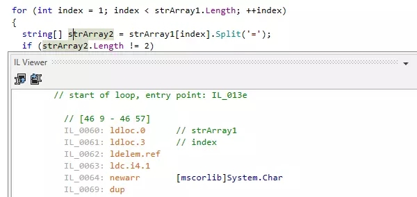 或者,您也可以选择以反编译的 C# 代码的注释形式显示 IL 代码,这实际上会将它的默认文本查看器和通常单独的 IL Viewer 窗口合并显示在一个视图中。