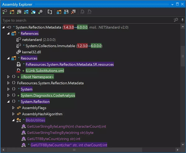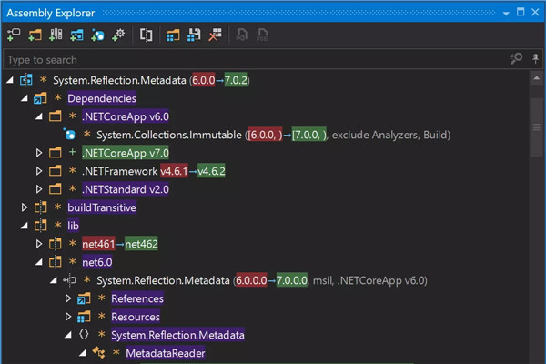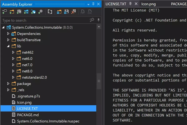 在 Assembly Explorer 中浏览 NuGet 软件包时,您现在可以查看这些 NuGet 软件包中包含的所有文件和文件夹。