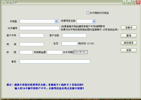 四、 办理新卡:先选择好卡类型,和消费项目名称,输入客户卡号,把光标放在ID卡编号那里,直接刷卡,D卡编号自动出来,再输入好电话等,再点发新卡按钮,卡办好后,如要修改,先输入ID卡编号,然后点“查询”按钮,会员信息查询出来后再直接修改数据,修改完数据后(ID卡编号和客户卡号不能修改),再点修改保存按钮。