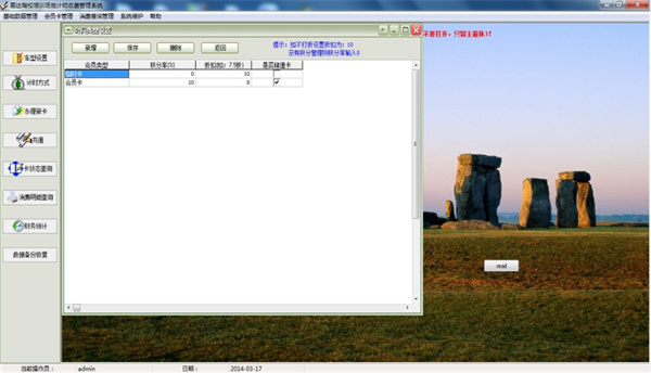 主要操作流程:1、设置好卡类型,不是储值卡的设置为临时卡,为储值卡的设置为会员卡。也可以自已设置其它的,系统默认为临时卡和会员卡两种。