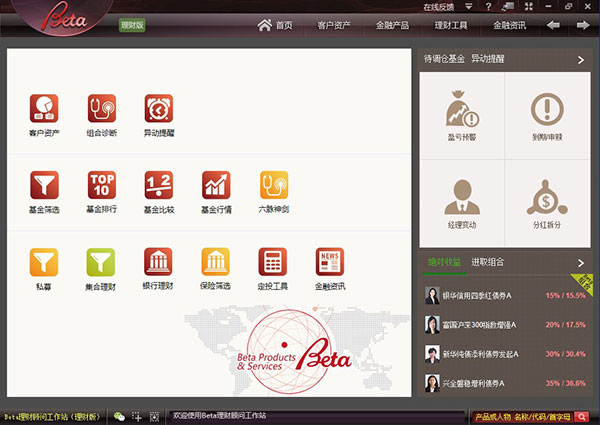 Beta理财顾问工作站pc桌面版,一般也被称作Beta理财师电脑版。它是由上海贝耳塔信息技术有限公司推出的一款金融产品销售与客户服务的工具平台。它为理财经理提供各类金融产品查询、客户账户诊断报告查阅下载、产品组合异动提醒、理财资讯与研究报告等功能。该工作站主要用于支持国内各类财富管理机构的一线销售人员,帮助他们进行金融产品销售和客户服务工作。Beta理财顾问工作站的功能包括金融产品查询与演示、组合诊断与售后服务、金融资讯解读等。通过该工作站,理财经理可以查询各类金融产品的信息,并向客户提供相应的理财建议。同时,他们还可以通过该工作站查阅和下载客户账户的诊断报告,及时了解产品组合的异动情况。此外,工作站还提供了丰富的理财资讯和研究报告,帮助理财经理及时了解市场动态和投资趋势。