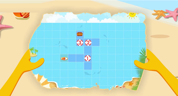 10、安排正确路线展现思维逻辑条理性,拖动方框到右侧区域,把小船移动到宝箱的正确步骤排列出来。