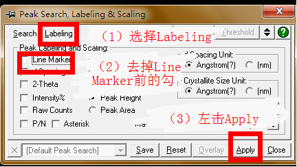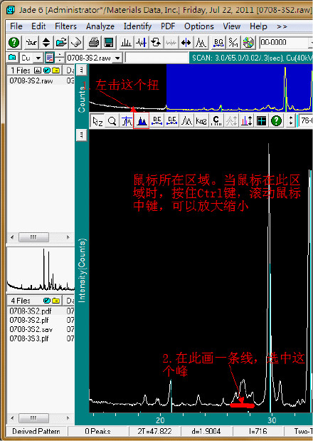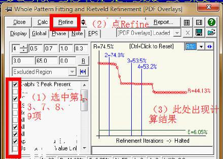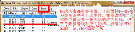 在大海捞针的基础上,左击图7方框内的按钮,然后按照图8内标明的步骤操作。然后重复大海捞针的操作(与大海捞针不同的是,此时系统只选择与你选中的峰对应的物相)。
