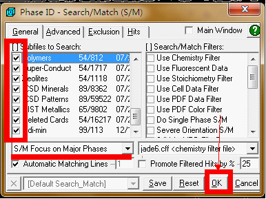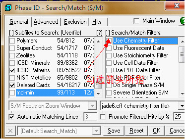 (1)“大海捞针”物相分析:右击图3箭头所指按钮,出现图4所示标签。在General选项里,首先勾选上左侧的所有的库,去掉右侧所有的对勾,其他设置如图4所示,最后左击ok。