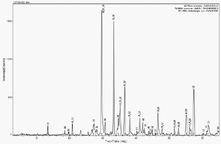 完成上述步骤,出现图5所示界面。显示了矿物名称、化学式、FOM值、PDF-#、RIR等内容。矿物的排序是按FOM值由小到大排列的,FOM值越小,表示存在这种矿物的可能性越大(但不绝对)。当鼠标左击到一个矿物时,在X衍射图谱显示栏会显示蓝色的线,选择与X衍射图谱拟合最好的矿物,然后在矿物名称前面勾选,表示你认为存在此矿物(如图6)。注意:选择矿物时,要尽量选取有RIR值的矿物,否则后面的定量工作将不能继续。