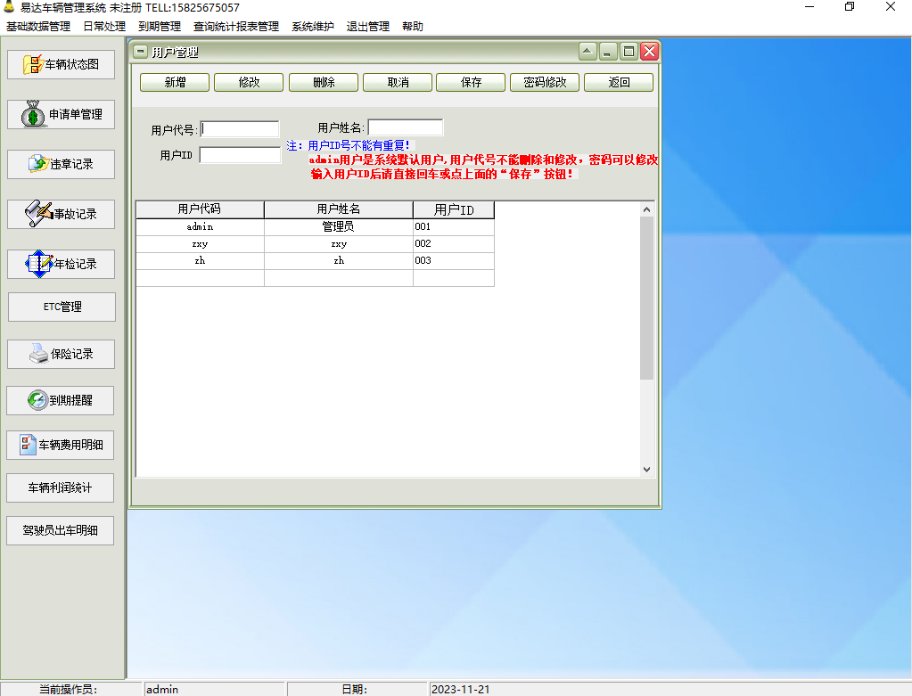 1、基础设置基础设置包括对系统编码、部门、职员、驾驶员、往来单位、车辆档案、配件的管理。同时可以管理车辆和驾驶员的图片资料。2、日常处理日常处理包括用车申请(可短信通知)、出车记录、加油记录、维修记录、规费管理、保养记录、违章记录、事故记录、年检记录、保险记录、病事假管理、收入管理、短信管理等,用户可自定义费用类别,在规费管理中实现各类费用的管理。