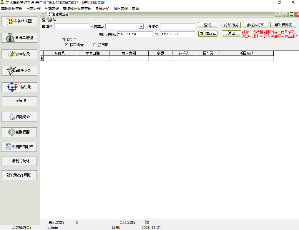 4、报表管理包括日常处理中的相关报表,以及车辆费用明细表和车辆费用统计表。