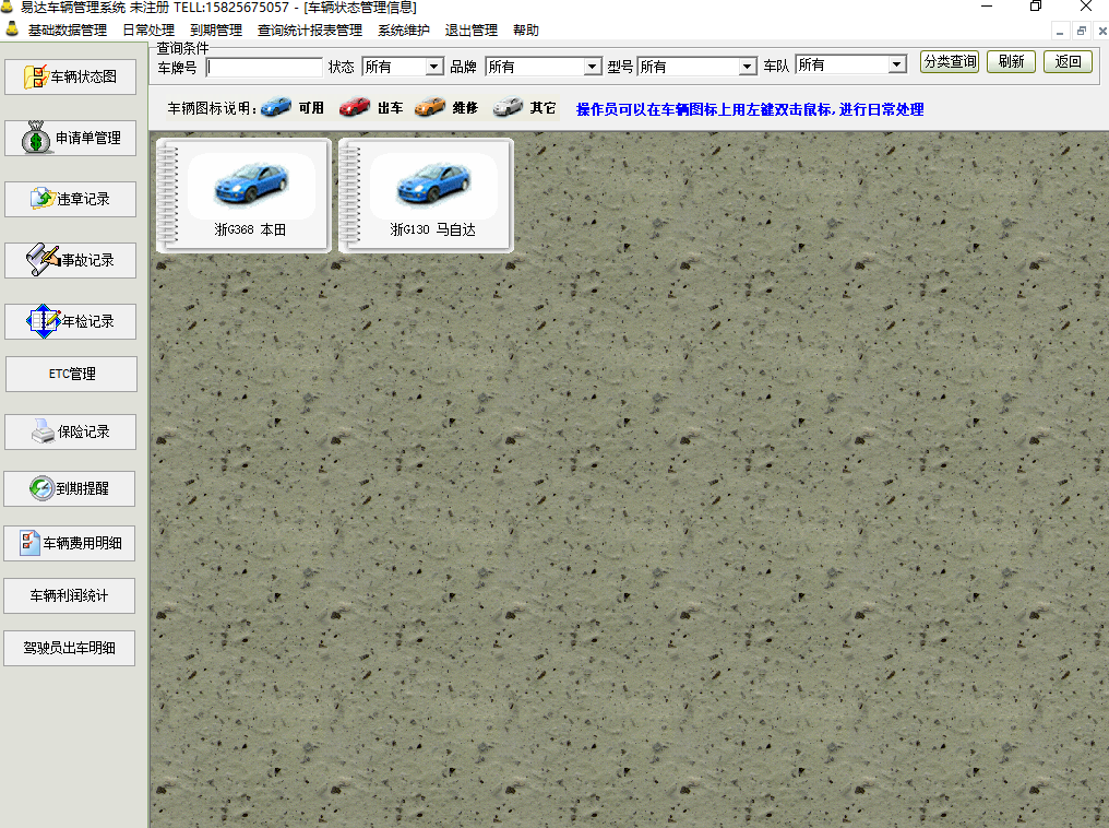 易达车辆管理系统是由温州市易达软件有限公司开发的一款非常实用的车辆管理软件,适用于事业单位或者车辆运营公司,其主要的模块有:车辆状态图、申请单管理、违章记录、事故记录、年检记录、保险记录、到期提醒、车辆费用明细,软件用户界面设计合理,美观,操作便捷,容易上手,主要面向企业事业单位,车辆运营公司,主要功能有驾驶员档案、车辆档案管理、油卡管理、配件信息、车辆状态图管理、用车申请管理(可短信通知)、车辆出车管理、车辆加油管理、车辆维修管理、车辆规费管理、车辆保养管理、车辆违章管理、车辆事故管理、车辆年检管理、车辆保险管理、病事假管理、车辆收入管理、短信管理等,并有车辆年检到期提醒、车辆保险到期提醒、车辆保养到期提醒、车辆规费到期提醒、驾照到期提醒,可分车队管理车辆,是高效的车辆管理软件,车辆管理系统。有需要的用户可以来下载了