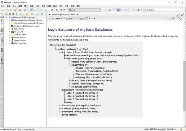mybase Desktop官方版是一款非常专业的用于分类管理自由格式资料的数据库软件,用户可以在这里根据自己的需要自定义文件格式及层次关系。用户可以利用它轻轻松松的管理各式各样的信息,例如磁盘文件、资料、下载软件等,即使毫无规律的资料,在这里用户一样可以管理的井井有条。与传统意义上的数据库软件不同,myBase 7.0提供了更好的方式使知识/资料/信息的捕获、编辑、组织、查看、索引、搜索和分享变得更快捷、更容易,且无需任何SQL数据库编程技能;通过内置的富文本编辑器接受图文信息的输入,并按树形大纲分门别类保存,同时接受任意磁盘文件作为树形大纲条目的附件,可以方便建立条目关联、加贴内容标签、关联日历日期和添加超链接引用等。利用本软件可以方便快捷的构建出多层次、多维度、带交叉引用、支持快速查询、层次分明、一目了然的个人知识库,帮助自己将大量杂乱无章的碎片化知识点重新进行系统化的归纳整理和消化吸收,从而在大脑中建立完整的知识体系结构,保持思路清晰,有助于提升个人能力和学习/工作效率。