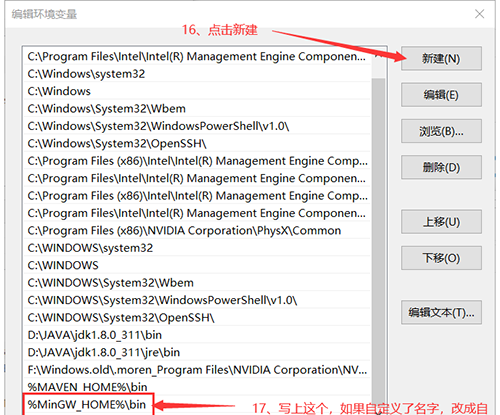4、点击环境变量,找到系统变量的path变量,在最后加上“;C:\MinGW\bin”。