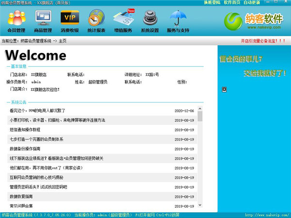 纳客会员管理软件是一款功能强大,操作简便的会员管理系统。是店铺进行会员制管理、会员卡管理、会员积分管理、会员消费管理、会员营销、结算收银必备工具。是采用CS客户端架构的一款适合单个及少量店铺使用的会员管理系统,拥有短信群发、邮件群发、邮件备份、来电弹屏,库存管理、员工提成,生日提醒,库存提醒等方面功能。尤其在会员管理方面具有快速消费获取积分,直接给会员加减积分,积分清零,会员换卡,会员挂失锁定,会员充值,会员充次,会员推荐等等,是一款强大的会员管理专家级系统。