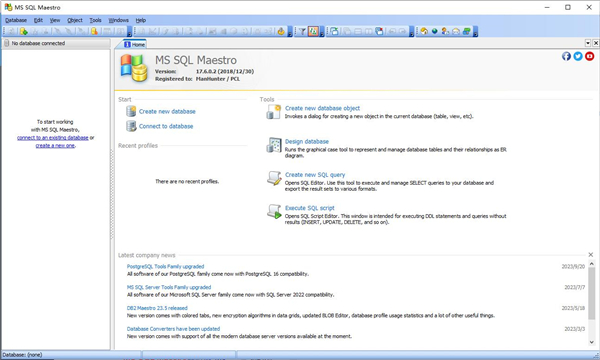 通过该窗口,您可以快速访问“创建数据库对象”对话框,架构设计器,SQL编辑器和SQL脚本编辑器最近使用的数据库配置文件。 在页面底部显示最新的公司新闻和当前的折扣计划。