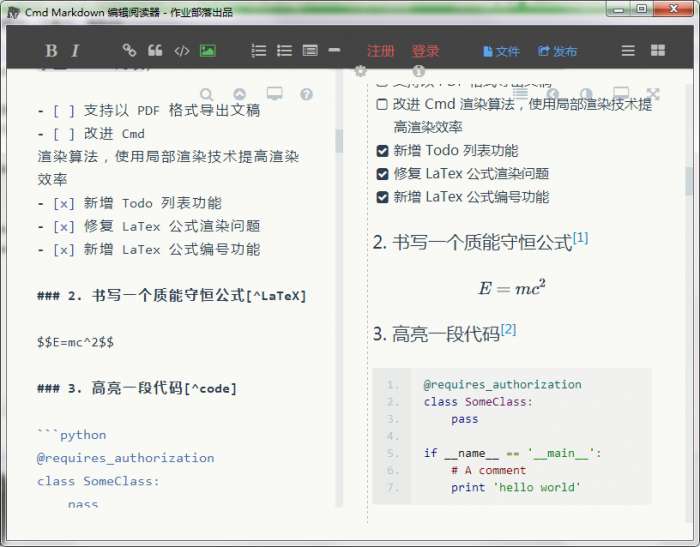 我们将 Cmd Markdown 的主界面一分为二,左边为编辑区,右边为预览区,在编辑区的操作会实时地渲染到预览区方便查看最终的版面效果,并且如果你在其中一个区拖动滚动条,我们有一个巧妙的算法把另一个区的滚动条同步到等价的位置,超酷!