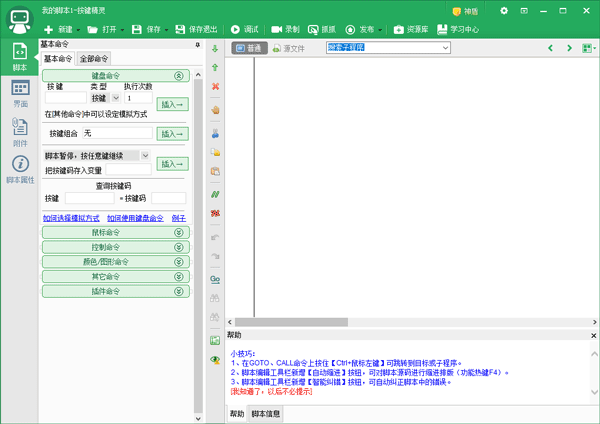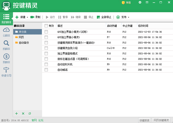 您可以新建或录制脚本,哪怕不懂代码也能直接点击使用脚本精灵里的命令来制作脚本或是直接使用录制功能录制键鼠的轨迹和使用,没有专业基础也能学会。选择勾选有效的脚本,通过设置热键,您可以随时一键运行和停止脚本,省心省力。