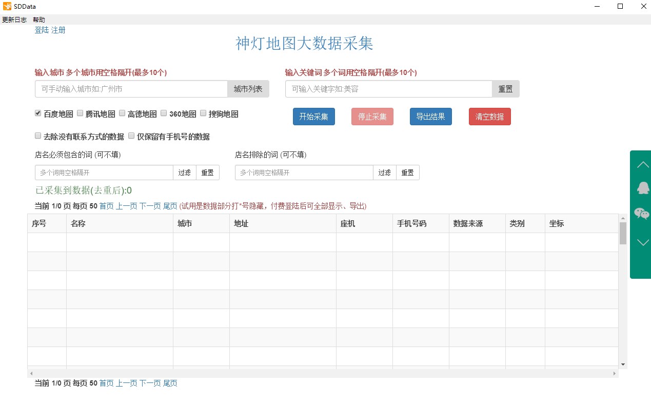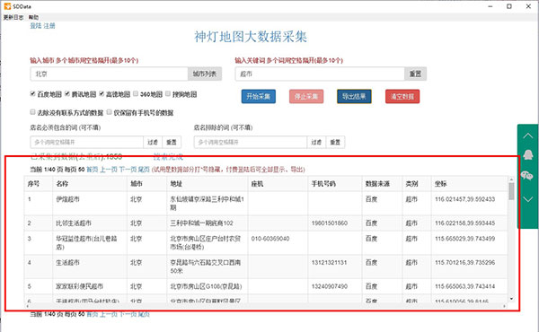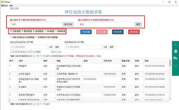 神灯地图大数据采集官方版是一款操作简单,采集无限制的地图数据采集软件。主要针对百度地图、高德地图、腾讯地图、搜狗地图、360地图等主流电子地图上的商户信息进行实时采集,搜索结果包含商户名称、电话联系方式、地址、坐标信息,可以精准的获取各行业精准客户数据。可以实时采集,采集速度非常的快,并且有着最全的地图数据,大数据Al更是让你使用起来更为简单。支持多个关键词和排除关键词,剔除不想要的数据,自动去除重复数据,数据匹配更为精确。可以将数据导出excel表格、手机通讯录格式等,更利于统计收集数据。并且可以免费使用,无采集次数限制,想用就用。可以说是您精准营销的必备软件。有需要的用户可以下载体验!