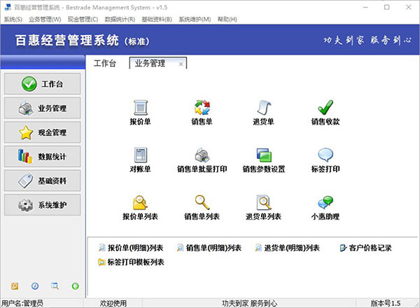 百惠经营管理系统是由佛山好的科技有限公司开发的一款非常实用的销售管理软件。该软件依据市场需求和结合小微企业自身特点打造,它以销售管理为中心,集合了销售管理所需的所有功能,不断优化完善;遵循“简单、实用、好用”的设计原则,实现小型协同办公的中心思想。百惠经营管理系统具有业务管理,现金管理,工作台,数据统计等功能,在各大项下还包含多种小项可供使用,在企业贸易管理方面非常实用。以销售管理为中心,集报价单管理、现金记账、产品资料管理、客户管理、销售收款、客户对账、数据统计等功能于一身,软件设计轻巧且功能强大;数据安全性高,性能稳定,并且该软件无需提前录入资料,支持即输即打,数据自动保存到资料库,再次开单无需重复录入,开单支持多种快速录入产品方式,支持扫描枪录入、产品编码录入、进入资料库快速选择等。软件设计轻巧且功能强大,可靠安全,是小微企业管理软件的理想产品,有需要的用户就可以来下载了。