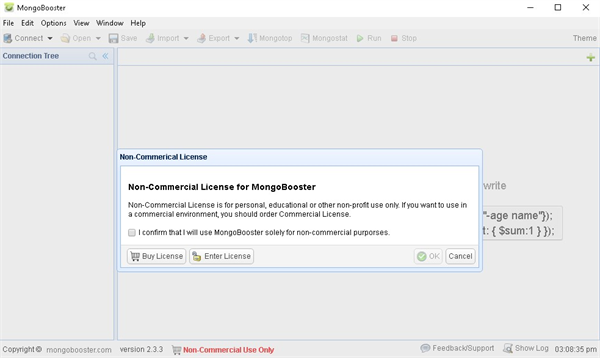 一旦一切就绪,你可以连接到MongoDB服务器用一个简单的双击视图包含数据库以树方式上市。在主窗口的MongoBooster你可以连接到任何数据库,和应用程序将把他们组织成多个标签。