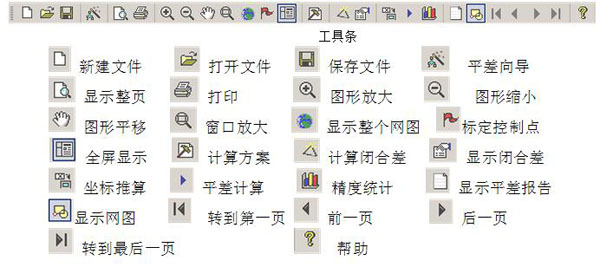 2、工具条:保存、打印、视图显示、平差和查看平差报告等功能