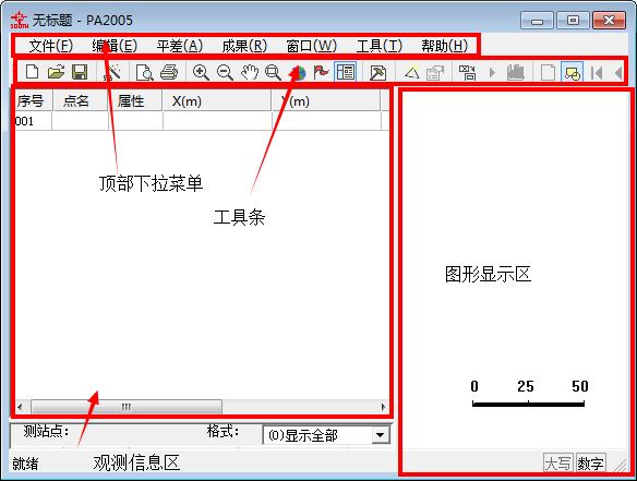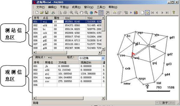 平差易2005主界面中包括测站信息区、观测信息区、图形显示区以及顶部下拉菜单和工具条