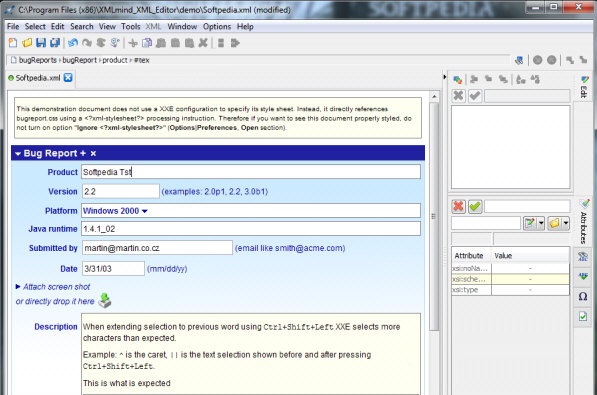 XMLmind XML Editor是一款非常不错的XML和schema的可视化数据编辑分析工具。XMLmind XML Editor简单好用,可以展现多个窗口。你可从树形图、列表、表格、文字模式和跳出式编辑区等方式操作任何XML数据。它拥有的复制和粘贴功能让使用者复制任何XML 文字到系统剪贴簿上,然后贴到任何XMLmind XML Editor窗口,XMLmind XML Editor支持双向xpath,所以只要点任何XML节点或属性,一个标准的Xpath就出来了。它两栏的文字展现方式方便比较和编辑。XMLmind XML Editor的图式完全支持树形图、列表、集合观看模式、文字模式。有了它,你还能轻易把微软Excel、Access和任何ODBC数据转成XML格式。新版本增加了XML数据的图表与统计分析功能。感兴趣的朋友欢迎下载体验!