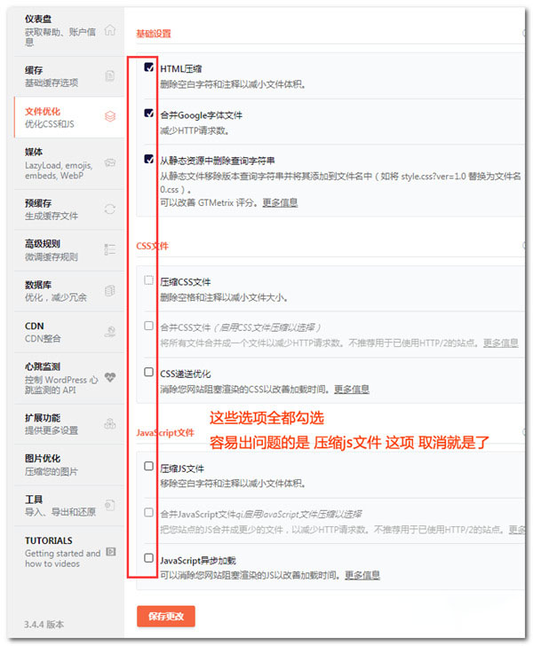 大部分可能的问题都出在勾选【压缩js文件】上面,也有部分网站问题出现在合并css文件、合并js文件上面,所以一旦出现问题了取消这项勾选会解决问题。