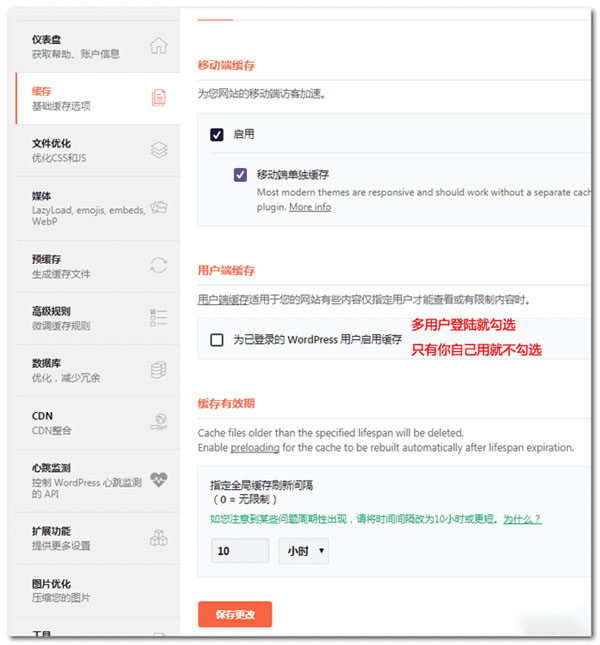 如果网站有多个用户注册登录使用,就勾选【为已登录的 wordpress用户启用缓存】,如果只有你自己管理的网站就不要勾选;