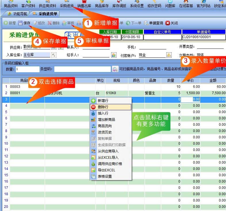 新增行:已经保存过的单据,需要修改添加新产品时,可以点鼠标右键增加行可增加空行。