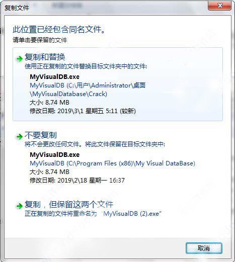 4、将补丁复制到软件根目录下,选择替换操作。默认路径为:C:\Program Files (x86)\My Visual DataBase