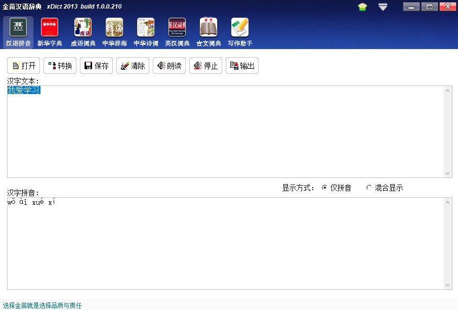 金苗汉语辞典官方版是一款用于辅助汉语学习的软件。金苗汉语辞典集合了汉语拼音、新华字典、成语词典、中华辞海、中华诗词、英汉词典、古文词典、写作助手等多功能于一身,用户不用再去准备一堆的字典,辞典,有这一个就够了,并且软件还带有语音发声,可以帮助用户掌握准确的发音。金苗汉语辞典以“绿色、安全”为设计理念,以“方便、实用”为设计原则,操作简单化、智能化,内容切合实际,绝无华而不实之感,适用于各个知识层次人士使用,无论对提高学生的汉字认知及语文写作水平、还是成人的文学素养都有很大的益处。是一个精巧、全面、新颖的桌面应用学习工具。金苗汉语辞典收集了中国所有的国标汉字,几乎所有的规范成语,全面、权威、科学,是一款优秀的学习助手工具软件。金苗汉语辞典的logo就是一株小苗在书本里发芽,辞典就像一株小苗,慢慢的结成一课大树。陪伴你在知识的海洋里前进。功能强大,使用简单是它最大的特点。本软件无任何插件,病毒,完全免费。有需要的朋友请放心下载。