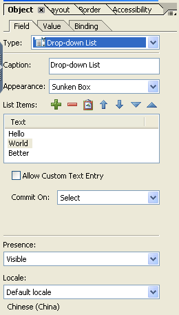 3、在表项(List Items)下,我们可以自由添加/删除需要的表项,并且可以为它们随意排序。除此之外,Designer还为下拉式选单提供了一个选择框,’Allow Custom Text Entry’,它的作用是,当用户在下拉表项中没有找到自己需要的项目时,可以手动填写自己需要的内容。同时,在生成表单的时候,下拉式选单的默认值也是可以定义的,如果什么都不填的话,默认为空。预览的结果如下图: