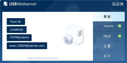 USBWebserver是一款功能实用且一键式电脑本地快速架设PHP网站环境的工具,尤其是针对USB移动设备进行设计开发,可以很好的兼容各种USB外接口的存储设备,其中包括U盘,移动硬盘等都可进行数据保存,这样就没有电脑设备的时间地点限制了,随时便可进行网站进行开发和调试。当然,USBWebserver还集成了Apache (httpd)、PHP、MySQL 以及PHPMyAdmin 等组件,支持各种流行的PHP程序如WordPress、Discuz、DedeCMS等,采用简单便捷的一键式快速架设,没有复杂的环境配置步骤,就算是初学者也能很快的上手。