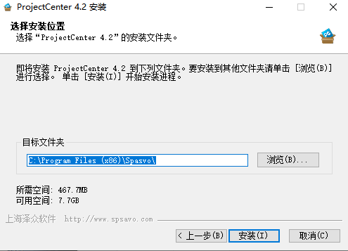 4、选择程序的安装路径,默认路径为C:\Program Files (x86)\Spasvo\,可点击浏览更换安装路径,或直接默认,但需注意该程序全部安装需要470M的空间,请确保所选择的硬盘满足其安装要求,然后点击安装。