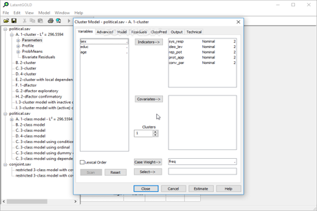 LatentGOLD是一种用于分析基因组学数据的软件工具,主要用于人类遗传学和基因组学研究领域。它可以用于分析单核苷酸多态性(SNP)、短串联重复序列(Short Tandem Repeats,STRs)、微卫星(microsatellites)等基因组学数据,并提供了多种分析功能,包括基因型推断、遗传结构分析、遗传分化分析、群体结构分析等。