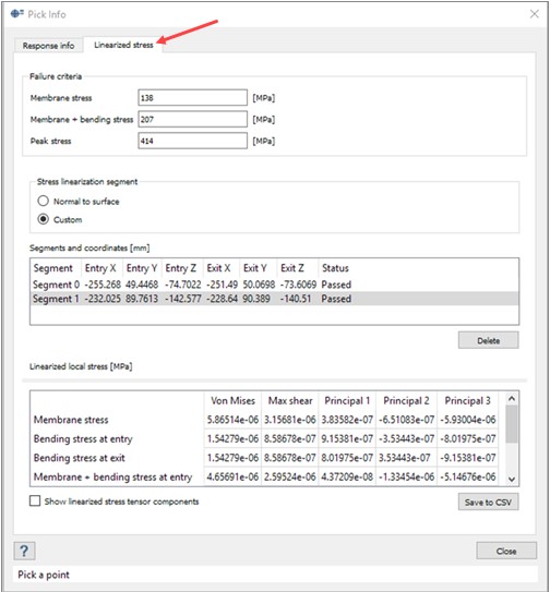 您可以通过上的拾取信息选项卡访问线性化应力函数分析工作台。您可以绘制垂直于曲面的应力线性化线段,或者通过拾取线段的端点来定义它们。