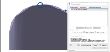 您可以修复带有自相交的图纸以移除自相交。您也可以修复具有不同于标称厚度的区域的薄板,使整个零件具有均匀的标称厚度。SimSolid用红色表示自相交的薄板,用橙色表示不同于标称厚度的薄板。修复表的过程是重复的,您可能希望修复表并重新运行以确认所有缺陷都已正确修复。重新运行,直到达到预期效果。